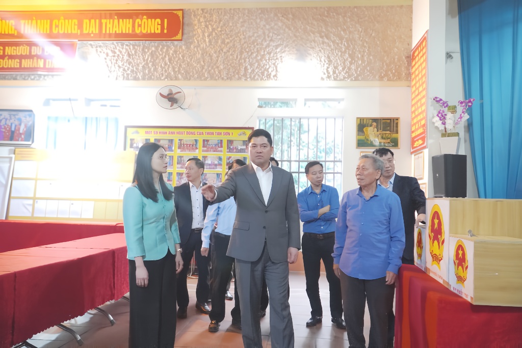 Trực tiếp kiểm tra tại khu vực bỏ phiếu Nhà văn hóa thôn Tân Sơn 1, Bí thư Tỉnh ủy Nguyễn Hồng Thái ghi nhận và biểu dương tinh thần chủ động, trách nhiệm của cấp ủy, chính quyền và Ủy ban bầu cử xã Tân Dĩnh.